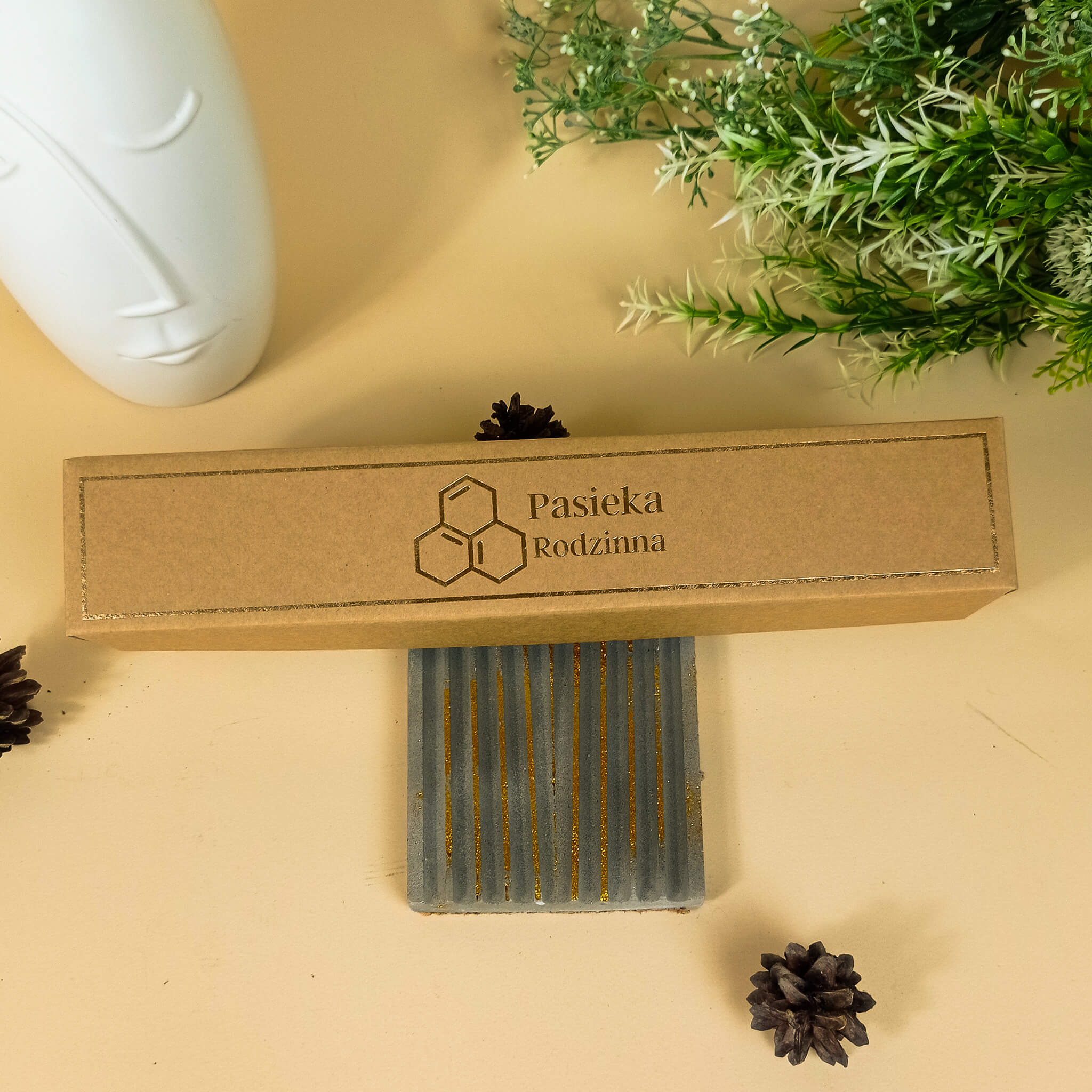 - Ozdobny kartonik: Elegancki kartonik z wytłoczonym złotym logo "Pasieka Rodzinna", wykonany z tektury posiadającej certyfikat FSC, co gwarantuje, że pochodzi z odpowiedzialnie zarządzanych lasów.