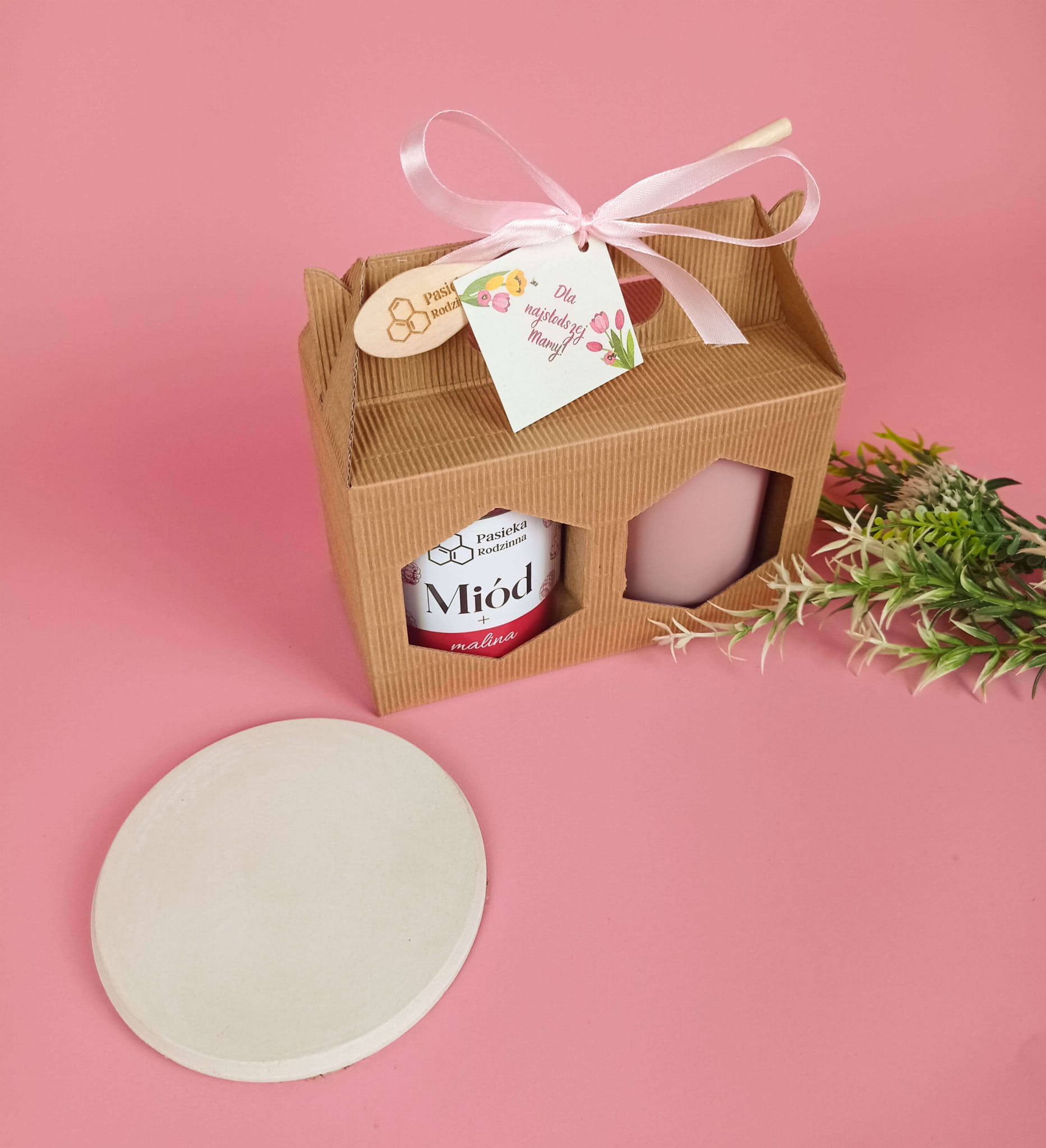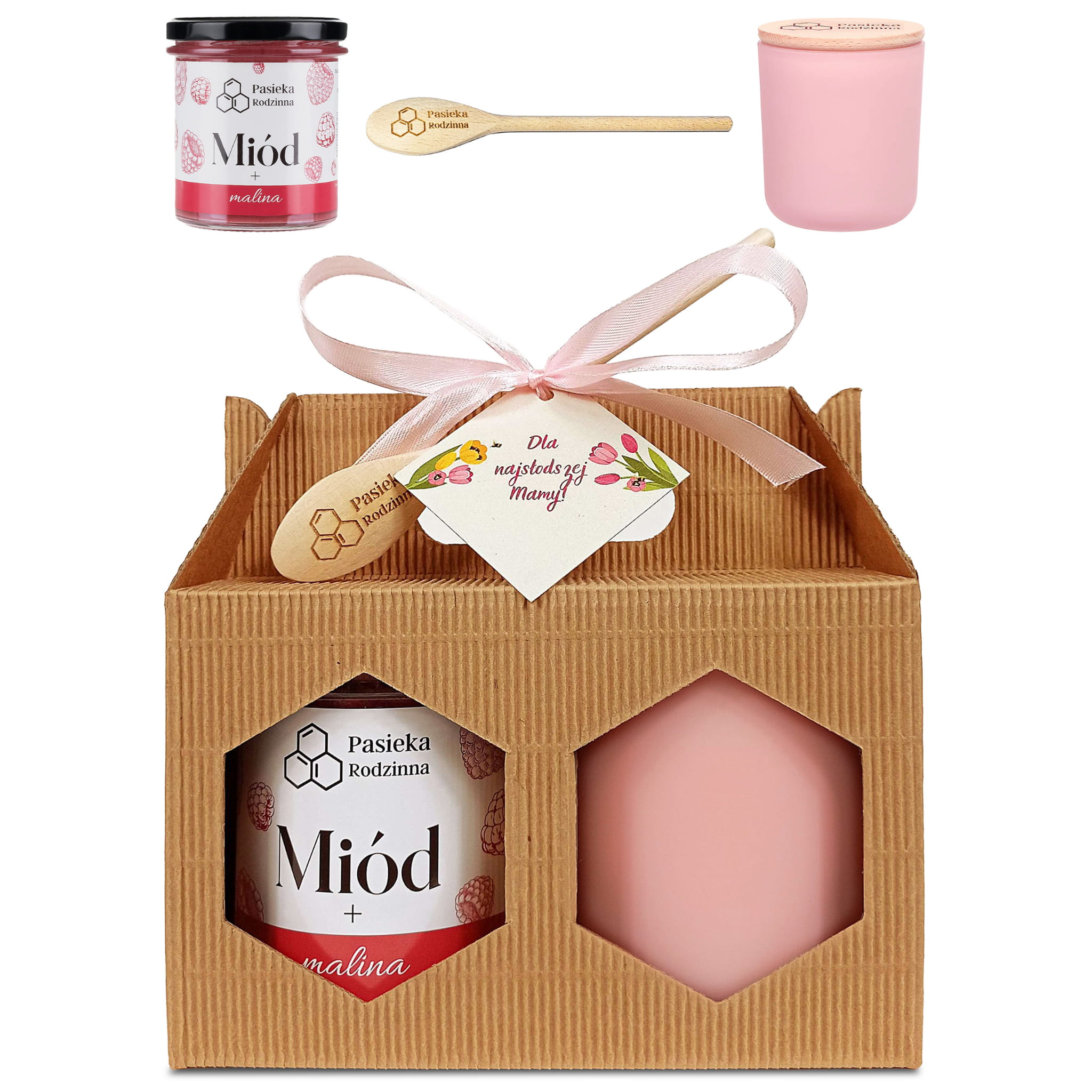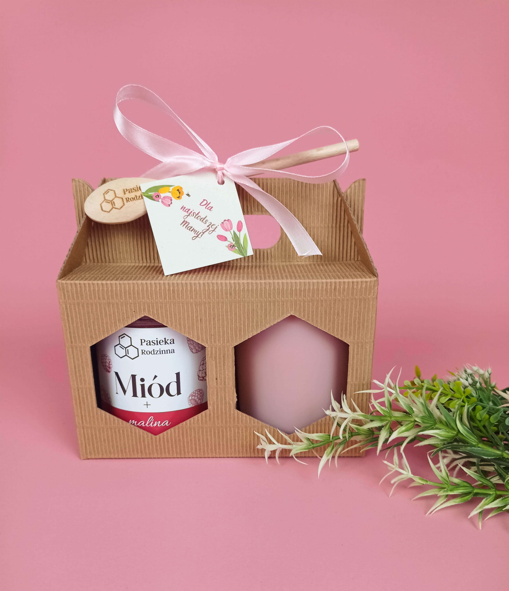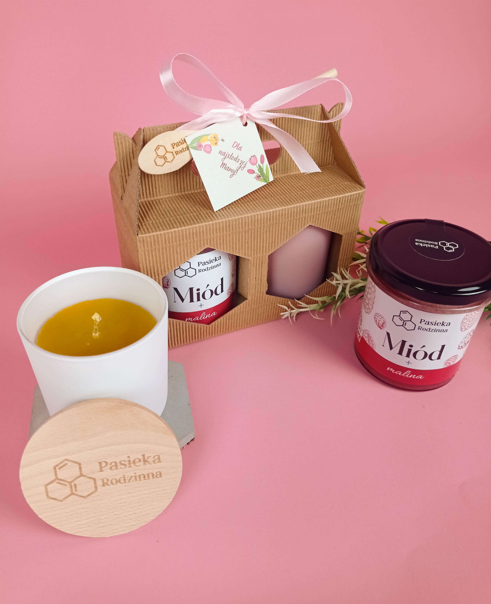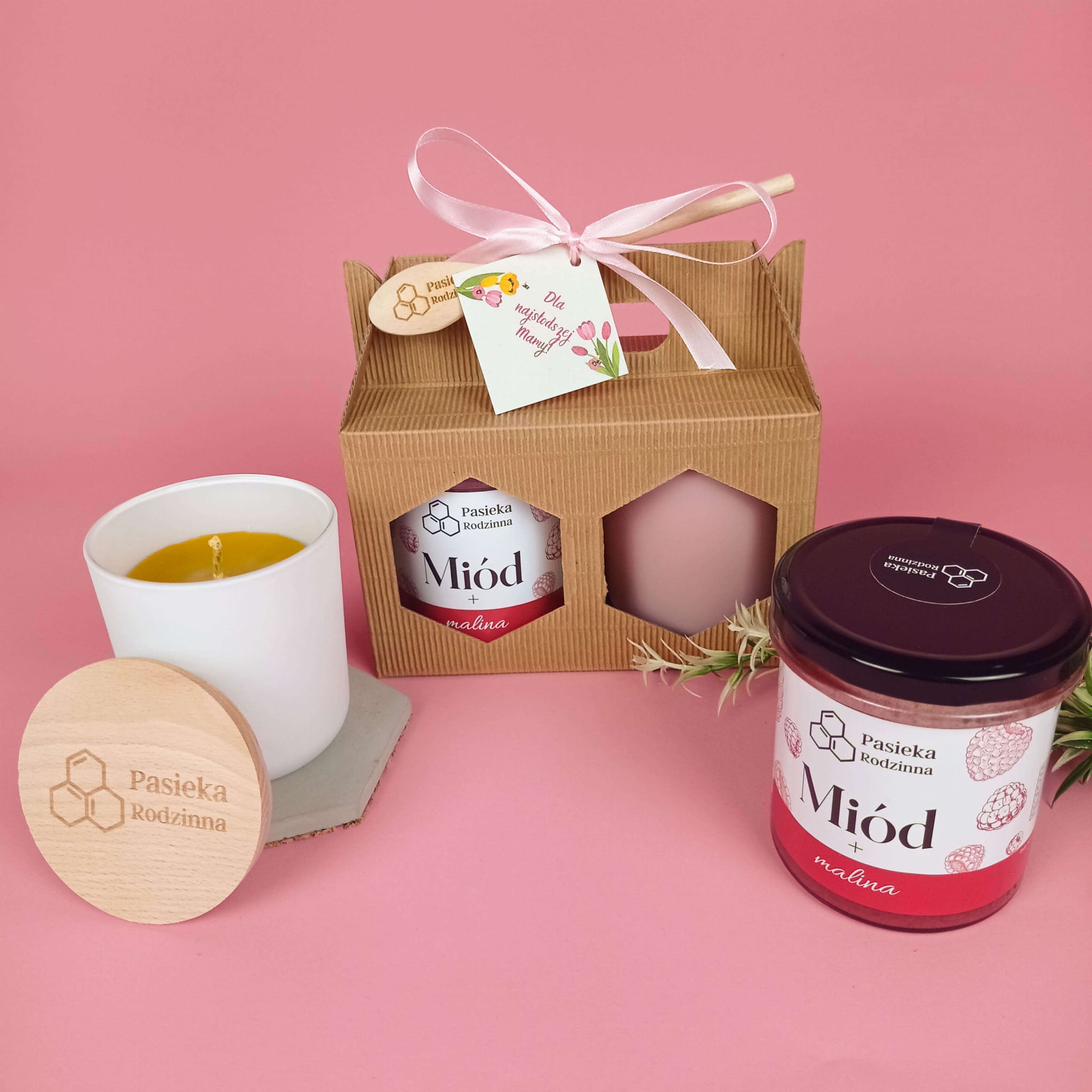Zestaw prezentowy z miodem 410g i świecą z wosku pszczelego na Dzień Mamy