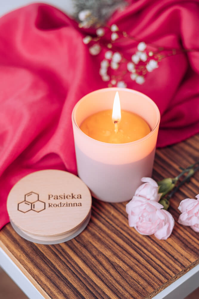 - Świeca z wosku pszczelego 270 ml w ozdobnej szklance w kolorze Pudrowego Różu z drewnianym wieczkiem. Świeca z wosku pszczelego pięknie pachnie i tworzy ciepły, relaksujący klimat.